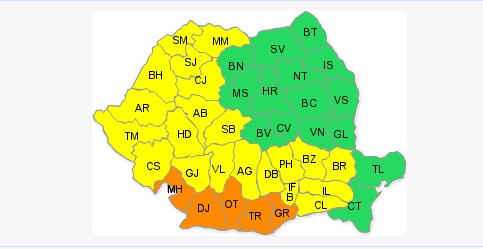 Duminică, sub Cod galben de caniculă se vor afla județele: Maramureș, Satu Mare, Sălaj, Bihor, Cluj, Arad, Alba, Timiș, Caraș Severin, Hunedoara, Sibiu, Gorj, Vâlcea, Argeș, Dâmbovița, Prahova, Buzău, Brăila, Ialomița, Călărași, Ilfov și București.