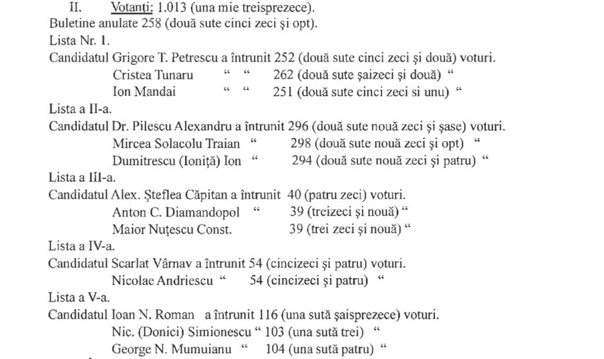 - Am tras la sorţi un număr de patru alegători asistenți, pe care l-am crezut necesar din lista alegătorilor asistenti prezenţi, iar sortul a căzut asupra D-lor. Const. Jipa, Petrea Manghes şi Zosim Băceanu.