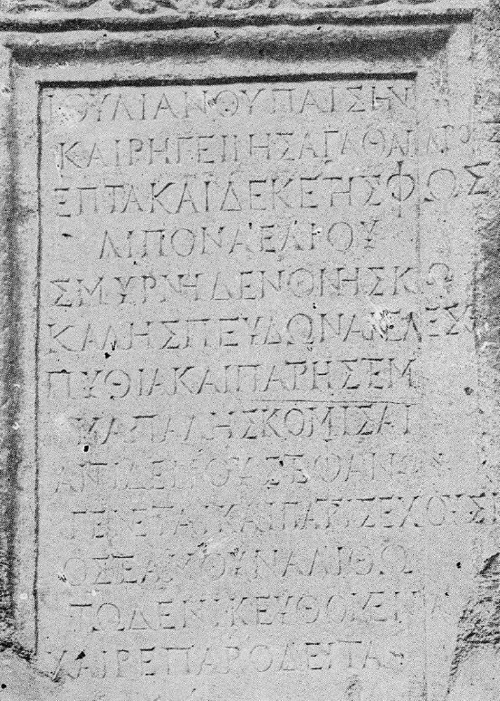 Iată traducerea inscripției: "Eram copil al lui Iulianus și al Reginei, eu Agathrandos, când am părăsit în vârstă de 17 ani lumina soarelui. Am murit în frumoasa Smyrna, unde m-am grăbit să merg pentru a învinge la Jocurile Pythice și a obține pentru patria mea coroana întrecerii. În locul coroanelor mele, rudele și patria au numai oasele mele, închise sub această piatră funerară. Salutate, trecătorule!"