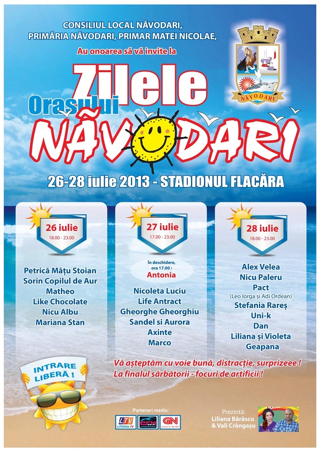 Începând de vineri, timp de 3 zile, orașul Năvodari va fi capitala distracției de pe întreg litoralul. Primăria și Consiliul Local organizează Zilele Orașului. Atmosfera se anunță incendiară, dacă ținem cont că pe scenă vor urca cei mai în vogă artiști ai momentului .”Cam în toți anii, năvodărenii au vrut mai mult, mai mult, din punct de vedere al surprizelor, al numelor importante care să vină la Năvodari. De data asta sper să fi întrunit toate aceste dorințe ale dumnealor și vrem să aducem la Năvodari pe Alex Velea, Antonia, nume celebre.”, a declarat Florin Chelaru, viceprimarul orașului Năvodari.