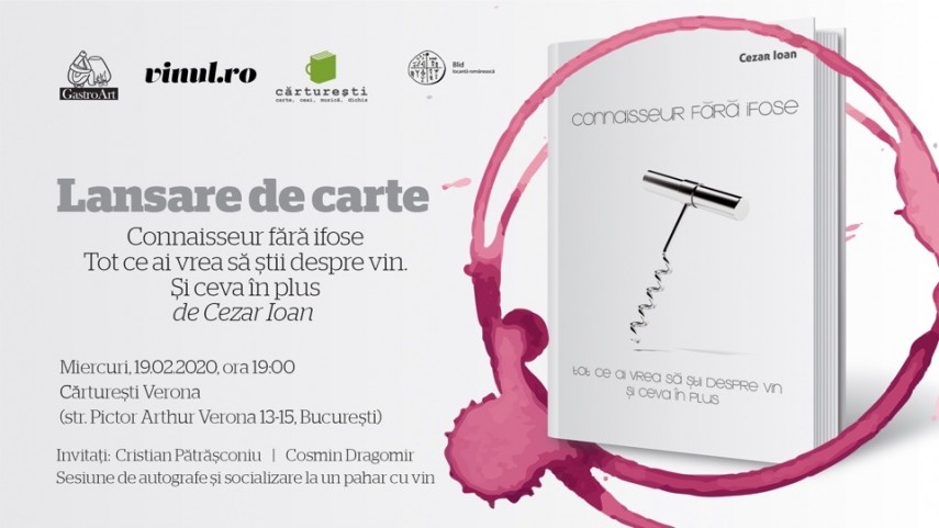 Editura GastroArt și vinul.ro au plăcerea să vă invite la lansarea cărții Connaisseur fără ifose - Tot ce ai vrea să știi despre vin. Și ceva în plus de Cezar Ioan.