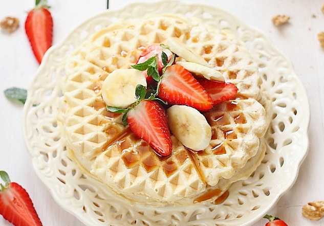 Noi le-am gustat cu sirop de artar, banane si capsune, dar va spun sigur ca sunt la fel de gustoase si simple, pudrate cu putin zahar pudra vanilat. Daca nu aveti un aparat pentru waffe, le puteti transforma in pancakes.Waffe de post – Ingrediente (8 waffe)
