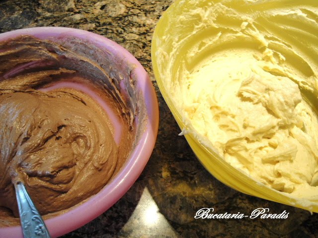 Adaugam si faina in ploaie amestecata cu praful de copt Impartim compozitia in doua parti egale. In una adaugam cele 2 linguri de cacao