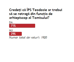 La sondajul lansat de ZIUA de Constanţa au participat 1.920 cititori. Dintre aceştia, 71% consideră că ÎPS Teodosie ar trebui să se retragă din funcţia de arhiepiscop al Tomisului, în timp ce 29% cred contrariul.