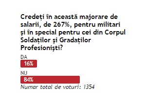 La începutul săptămânii trecute, în contextul unei intervenţii televizate a ministrului Muncii, Lia Olguţa Vasilescu, prin care anunţa că militarii vor beneficia de cea mai mare creştere salarială în perioada următoare, cotidianul ZIUA de Constanţa lansa sondajul de opinie cu întrebarea: „Credeţi că îşi va respecta Guvernul promisiunea privind majorarea salariilor militarilor care fac parte din Corpul SGP?“La sondaj au participat aproape 1.400 de persoane, dintre care peste 84% au răspuns că nu au încredere în această promisiune, restul de 16% declarându-se încrezătoare în cele spuse de oficialul guvernamental.