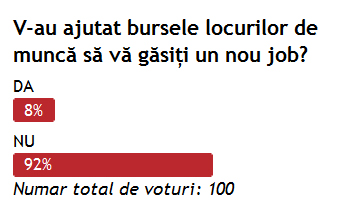 I-am întrebat pe constănţeni dacă i-a ajutat Bursa locurilor de muncă să-şi găsească un job nou, subiect care a stârnit numeroase reacţii din partea cititorilor noştri. Rezultatele sondajului, la care au participat 100 de persoane, au demonstrat că majoritatea respondenţilor, adică 92%, consideră că aceste burse nu îi ajută în paşii pe care îi fac pentru a găsi un nou loc de muncă, în timp ce 8% sunt de părere că bursele sunt utile în acest demers.