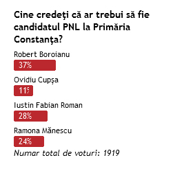 În acest context, cotidianul ZIUA de Constanţa a derulat, timp de o săptămână, un sondaj de opinie cu următoarea întrebare: „Cine credeţi că ar trebui să fie candidatul PNL la Primăria Constanţa?“. La acest sondaj au participat 1.910 cititori ai cotidianului ZIUA de Constanţa. Dintre aceștia, 38% au votat pentru Robert Boroianu, copreședintele Organizaţiei Municipale a PNL Constanţa, 11% pentru Ovidiu Cupșa, directorul CERONAV, 28% pentru consilierul local Iustin Fabian Roman și 23% pentru europarlamentarul Ramona Mănescu, fost ministru al Transporturilor în timpul guvernării USL.