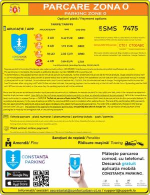Constanţa Parking este noul sistem de plată a parcării prin SMS ce a fost implementat începând cu data de 15 aprilie 2019. Aplicaţia Constanţa Parking este disponibilă deja şi poate fi descărcată gratuit din Google Play si AppStore. Odată descărcată, aceasta arată pe telefonul mobil o hartă cu zonele în care sunt disponibile parcările prin SMS: Blue Area pentru oraşul Constanţa, Green Area pentru staţiunea Mamaia şi Red Area pentru Mamaia Nord.Prin intermediul aplicaţiei, parcarea se poate achita prin card bancar, iar cu 5 minute înainte de expirarea timpului, utilizatorii sunt avertizaţi printr-un mesaj. Taxarea prin SMS se va face la numărul 7475. Programul de taxare în parcările cu tarif orar din Constanţa a fost modificat în septembrie 2019. În acest moment sunt mai multe zone în care maşinile pot fi lăsate gratuit în anumite intervale orare.