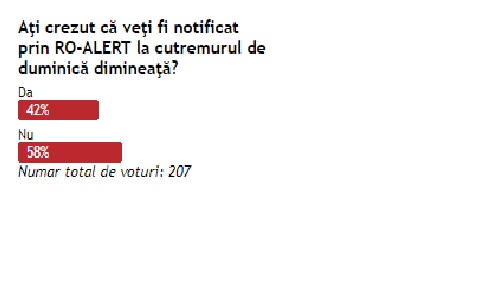 Aproximativ 200 de persoane au răspuns întrebării. Dintre acestea, 58% au răspuns că nu, în timp ce 42% au spus că se așteptau să fie alertate.