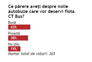 La sondaj au participat aproximativ 500 de constănţeni. 44% dintre ei au o „părere bună” despre noile autobuze, 38% au declarat că au o „părere proastă” despre proiectul municipalităţii de schimbare a flotei de transport în comun, iar 18% dintre participanţii la sondaj nu au nicio părere în acest moment.O parte dintre cititori au lăsat şi comentarii, cu privire la subiectul propus, pe care le redăm mai jos: