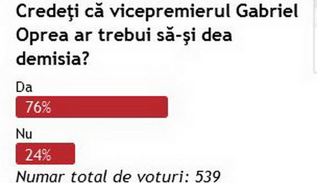 La sondaj au participat 539 de cititori ai cotidianului ZIUA de Constanţa. Dintre aceştia, 76% au votat pentru demisia ministrului Oprea, în timp de alţi 24% au votat împotrivă.