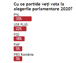 - 35% dintre respondenți au spus că vor vota cu PNL, 23% cu USR PLUS, 18% cu PSD, 5% cu PMP și un procent similar cu PRO România