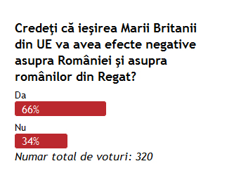 66% dintre cei care au participat la acest sondaj cred că România şi românii din Regatul Unit vor avea de suferit din cauza Brexit. De partea cealaltă, 34% dintre respondenţi cred contrariul.