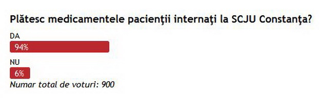 Pentru că o veche vorbă spune că întotdeauna adevărul se află undeva la mijloc, cotidianul ZIUA de Constanţa a lansat un sondaj de opinie pentru a vedea dacă au mai fost oameni puşi în situaţia de a cumpăra medicamente destinate pacienţilor internaţi pentru tratament în Spitalul Judeţean Constanţa. Astfel, am adresat cititorilor noştri întrebarea: „Plătesc medicamentele pacienţii internaţi la SCJU Constanţa?“ Dintre cele peste 900 de răspunsuri primite la acest sondaj, 94% dintre respondenţi au mers pe varianta „DA“, doar 6% dintre cei care au răspuns considerând că în Spitalul Judeţean Constanţa pacienţii internaţi NU plătesc pentru medicamentele administrate.„Am cumpărat tot, pe listuţă scrisă zilnic“ vs. „Nu am cumpărat niciun medicament“