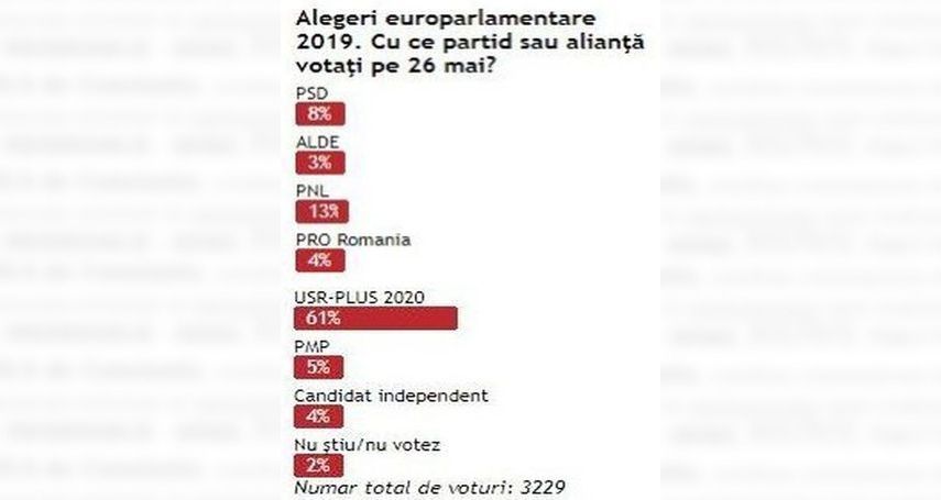 La sondaj au participat peste 3.200 de cititori. Ca urmare a centralizării preferinţelor la vot ale acestora la scrutinul din 26 mai pentru desemnarea viitorilor eurodeputaţi români, clasamentul rezultat în urma sondajului se prezintă astfel: PSD - 8%, ALDE - 3%, PNL - 13%, Pro România - 4%, USR-PLUS 2020 - 61%, PMP - 5%, Candidat independent - 4%, Nu ştiu, nu votez - 2%.
