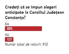 Nicuşor Constantinescu, şeful suspendat al Consiliului Judeţean Constanţa, se află, în prezent, în arest la domiciliu, după ce judecătorii Curţii de Apel Constanţa, respectiv ai Tribunalului Constanţa au stabilit această măsură în două dintre dosarele în care apare numele său. În urma acestor hotărâri, prefectul Constanţei, Ion Constantin, a emis ordinul de suspendare din funcţia de preşedinte al CJ Constanţa a lui Constantinescu. Astfel, în mai puţin de un an, mai-marele judeţului Constanţa a bifat două suspendări din funcţie. Despre toate faptele de care este acuzat Nicuşor Constantinescu puteţi citi pe larg în materialul: Nicuşor Constantinescu, un preşedinte de consiliu judeţean acuzat de peste 50 de infracţiuni În contextul în care Nicuşor Constantinescu este judecat în patru dosare şi cercetat în cel de-al cincilea, ZIUA de Constanţa a propus cititorilor săi un sondaj de opinie în care adresa întrebarea: „Credeţi că se impun alegeri anticipate la Consiliul Judeţean Constanţa?“ Aproximativ 1.000 de persoane au dat curs sondajului nostru, iar 88% dintre respondenţi consideră că ar trebui organizate alegeri anticipate la Consiliul Judeţean Constanţa. Doar 12% se declară mulţumiţi de modul de organizare actual al CJC, răspunzând „NU“ la întrebarea adresată.