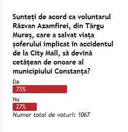 Sunteţi de acord ca voluntarul Răzvan Azamfirei, din Târgu Mureş, care a salvat viaţa şoferului implicat în accidentul de la City Mall, să devină cetăţean de onoare al municipiului Constanţa?