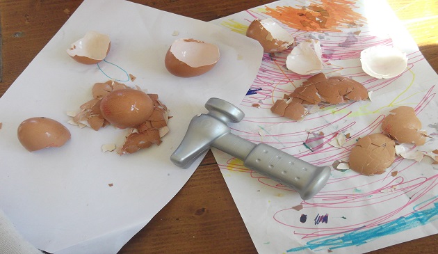 Ai nevoie de cinci - sase coji de ou, o lingurita de faina, o lingurita de apa fierbinte si colorant alimentar dupa preferinta. Cojile de ou trebuie spalate foarte bine, uscate si apoi pisate pana ce devin o pudra fina. Faina si apa se amesteca intr-un recipient, se adauga pudra de ou si colorantul.