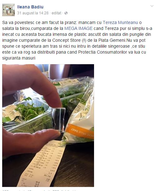 "Sa va povestesc ce am facut la pranz: mancam cu Tereza Munteanu o salata la birou, cand Tereza, pur si simplu, s-a inecat cu aceasta bucata imensa de plastic ascutit din salata din pungile din imagine. Nu va pot spune ce sperietura am tras si nici nu intru in detaliile singeroase, ce stiu este ca va rog sa distribuiti pana cand Protectia Consumatorilor va lua cu siguranta masuri", a scris Ileana Badiu.