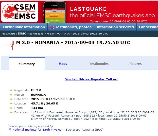 Potrivit Centrului Seismologic Euro-Mediteranean, cutremurul a avut loc la ora 22.25 la interferenţa coordonatelor georgrafice 45.71 N/26.65 E.