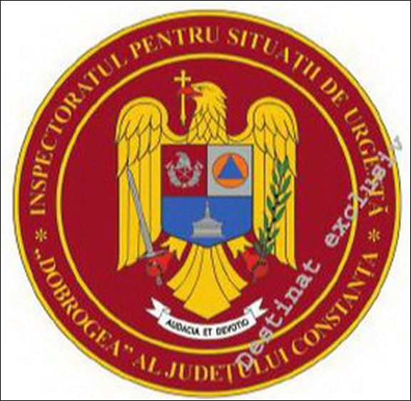 - în exergă, între două cercuri liniare, aurii, legenda este scrisă cu majuscule, din aur, pe fond purpuriu: „INSPECTORATUL PENTRU SITUAŢII DE URGENŢĂ DOBROGEA AL JUDEŢULUI CONSTANŢA“.