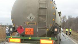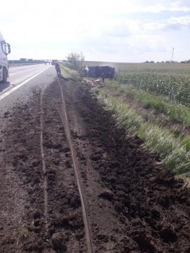 Pe autostrada A2 Bucureşti - Constanţa, la kilometrul 79, pe sensul către Capitală, o autocisternă încărcată cu combustibil lichid (kerosen) s-a răsturnat ieri în afara părţii carosabile.
