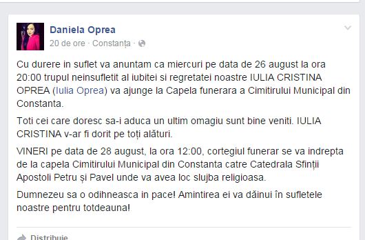 „Cu durere în suflet va anunţăm că miercuri pe dată de 26 august la ora 20:00 trupul neînsufleţit al iubitei şi regretatei noastre IULIA CRISTINA OPREA (Iulia Oprea) va ajunge la Capela funerară a Cimitirului Municipal din Constanţa.