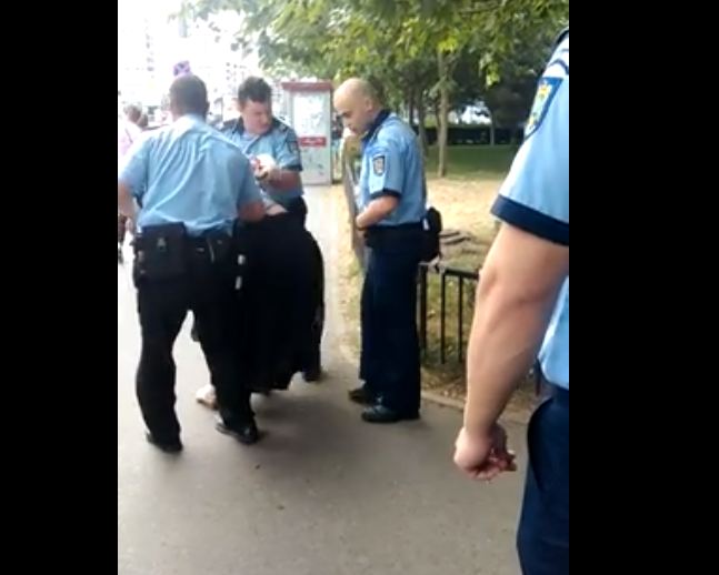 În imagini puteţi observa cum cei trei polițiști încearcă să o încătușeze pe femeia care țipă de durere, în timp ce trecătorii sunt revoltaţi de acţiunea oamenilor legii. Pentru a pune cătuşele "periculoasei infractoare", două echipaje de Poliție s-au căznit cu ea. Când în final au reuşit, polițiștii au urcat-o într-o mașină.