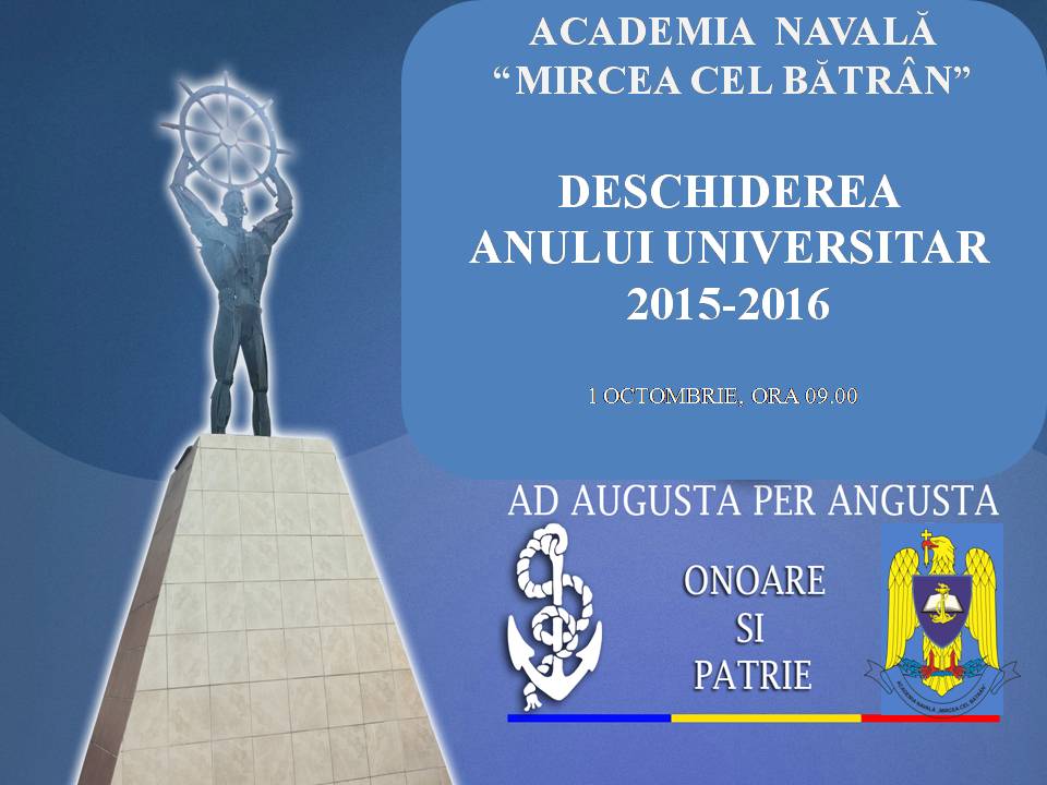 Academia Navală „Mircea cel Bătrân" organizează joi, de la ora 09.00, festivitatea de deschidere a anului universitar 2015-2016.Alături de colegii din anii mai mari, cei mai tineri studenţi civili şi militari din Academia Navală „Mircea cel Bătrân” vor frecventa cursurile Facultăţii de Navigaţie şi Management Naval şi pe cele ale Facultăţii de Inginerie Marină, în cadrul celor 13 programe de studii de licenţă şi de masterat acreditate de către Agenţia Română de Asigurare a Calităţii în Învăţământul Superior.