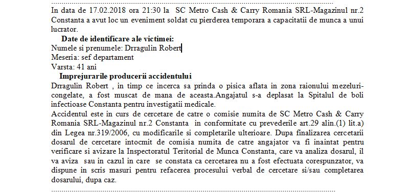 Accident de muncă inedit la un hipermarket din Constanța. Un angajat a fost mușcat de mână de o pisică