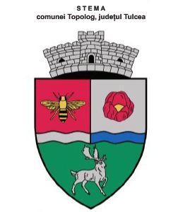 Astfel, stema comunei Topolog se compune dintr-un scut triunghiular cu marginile rotunjite, tăiat de un brâu undat, jumătate albastru, jumătate de argint, şi despicat în partea superioară. În partea superioară, în dreapta, în câmp roşu, se află o albină de aur. În partea superioară, în stânga, în câmp argintiu, se află un bujor roşu cu mijlocul de aur. În partea inferioară, în câmp verde, se află un cerb de argint. Scutul este timbrat de o coroană murală de argint cu un turn crenelat.