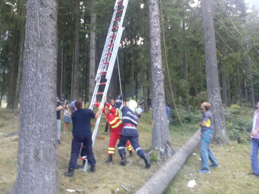 Este vorba despre un bărbat și o femeie. Pompierii au reușit să coboare femeia care a rămas agățată în brad și încearcă să-l dea jos și pe bărbat.