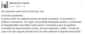 „Dragi prieteni de pe Facebook, aşa cum poate aţi aflat pe surse am ocazia să candidez la parlamentare la Constanţa, din partea PSD. Eu m-am dus şi am solicitat acest lucru lui Felix Stroe, nu invers. Am suficientă minte cât să fi intuit chiar de la luarea deciziei mele că prima tentaţie a celor care află această ştire este să mă ponegrească. Dar sper ca o bună parte dintre ei să aibă răbdarea, curiozitatea şi, scuzaţi, inteligenţa de a aştepta şi explicaţiile mele. Văd că sunt şocaţi mai ales unii care spun că aveau încredere în mine că sunt într-un anume fel. Încrederea, ca şi iubirea, ar trebui să se întreţină de la sine chiar în momente în care par puse în pericol, ca să fie cu adevărat demne de numele "încredere" sau "iubire". Poate că oi avea şi eu ceva de spus cu gestul meu, poate că am eu însumi mai multă încredere în mine decât aveţi voi în mine şi chiar sper să nu mă dezamăgesc. Poate că mă şi iubesc eu însumi pe mine (scuzaţi pleonasmul). Vreţi să mă îndoiesc de mine doar fiindcă voi vă îndoiţi brusc de mine? Vreţi să mă urăsc doar fiindcă voi mă urâţi brusc? Nu vă cer să mai credeţi în mine sau să mă iubiţi în continuare. Vă rog însă să mă lăsaţi să-mi dau eu mie o şansă să mai cred în mine, în cel care cred că sunt, în cel care vreau să fiu, pentru mine. Nu candidez pentru nimeni altcineva decât pentru mine. Eu cu mine mă voi lupta mai tare în noua postură decât cu oricare pesedist, penelist, pepizdamăsist. Sper să nu-mi fie silă de mine la final.
