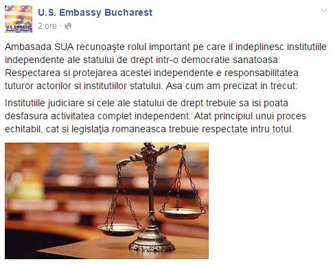 "Aşa cum am precizat în trecut: Instituţiile judiciare şi cele ale statului de drept trebuie să îşi poată desfăşura activitatea complet independent. Atât principiul unui proces echitabil, cât şi legislaţia românească trebuie respectate întru totul", se arată în postarea ambasadei pe Facebook.