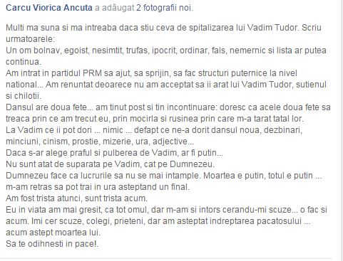 "Am scris înainte să moară Vadim Tudor cu 30 de minute. Se poate vedea acest lucru prin postarea făcută de mine mai jos. Vadim subiect închis. Sper că în România, să nu mai apară niciodată oameni politici gen Vadim Tudor. Vadim îmi datora 1000 lei, în urmă procesului de calomnie pe care l-am câştigat. Donez banii familiei să-i cumpere pantofi şi costum pentru a putea fi îngropat. Amin", a transmis Ancuţa.