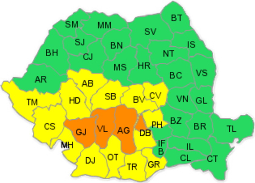 Județele care se află sub avertizarea ANM sunt: Cluj, Maramureș, Satu-Mare, Sălaj, Bihor, Alba, Arad, Timiș, Hunedoara, Caraș-Severin, Mehedinți și Dolj, Gorj, Olt, Teleorman, Giurgiu, Ilfov și București.