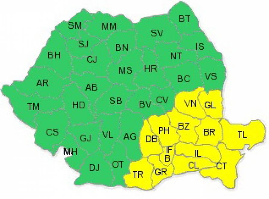 Avertizarea emisă de ANM este valabilă de astăzi, de la ora 21.00, până luni, la ora 14.00, în Bucureşti şi judeţele Ilfov, Teleorman, Giurgiu, Dâmboviţa, Prahova, Buzău, Ialomiţa, Călăraşi, Constanţa, Tulcea, Brăila, Galaţi şi Vrancea.