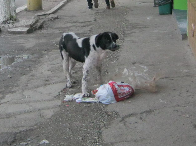 Un câine înfometat trăgea, ca şi cum nu ar fi mâncat de cine ştie câte zile, de nişte pungi pline cu reziduuri menajere, dar mai ales cu resturile pantagruelicei cine pregătită de o GOSPODINĂ din zonă pentru ziua de Paşte şi aruncate pe trotuar.