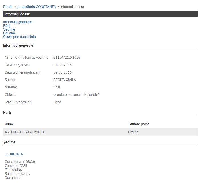 Pe rolul Judecătoriei Constanța-Secția Civilă a fost înregistrat dosarul cu număr unic 21104/212/2016 din data de 8 august având ca obiect acordare personalitate juridică.