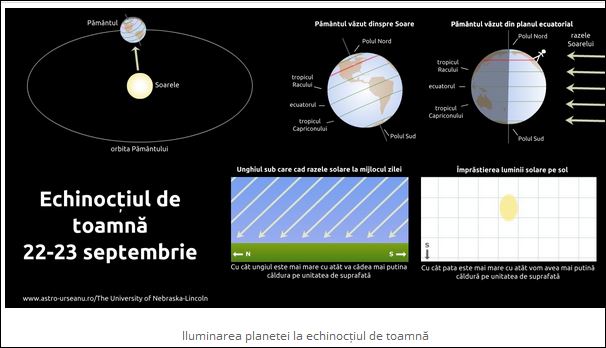 Punctul echinocțiului de toamnă, numit și „punct autumnal” , se află pe sfera cerească la intersecția eclipticii (ce reprezintă proiecția pe sfera cerească a planului orbitei Pământului) cu ecuatorul ceresc, pe care Soarele îl traversează la aceasta dată, trecând din emisfera nordică a sferei cerești în cea sudică. Aflându-se deci la această data în dreptul ecuatorului ceresc, Soarele va răsări și va apune chiar în punctele cardinale est și vest, durata zilelor fiind astfel egală, indiferent de latitudine, cu cea a nopților. Singurele excepții le întâlnim în regiunile polare, în zona polului nord incepând lunga noapte polară, iar în cea a polului sud Soarele ivindu-se deasupra orizontului, timp de 6 luni, până la momentul echinocţiului de primăvară.