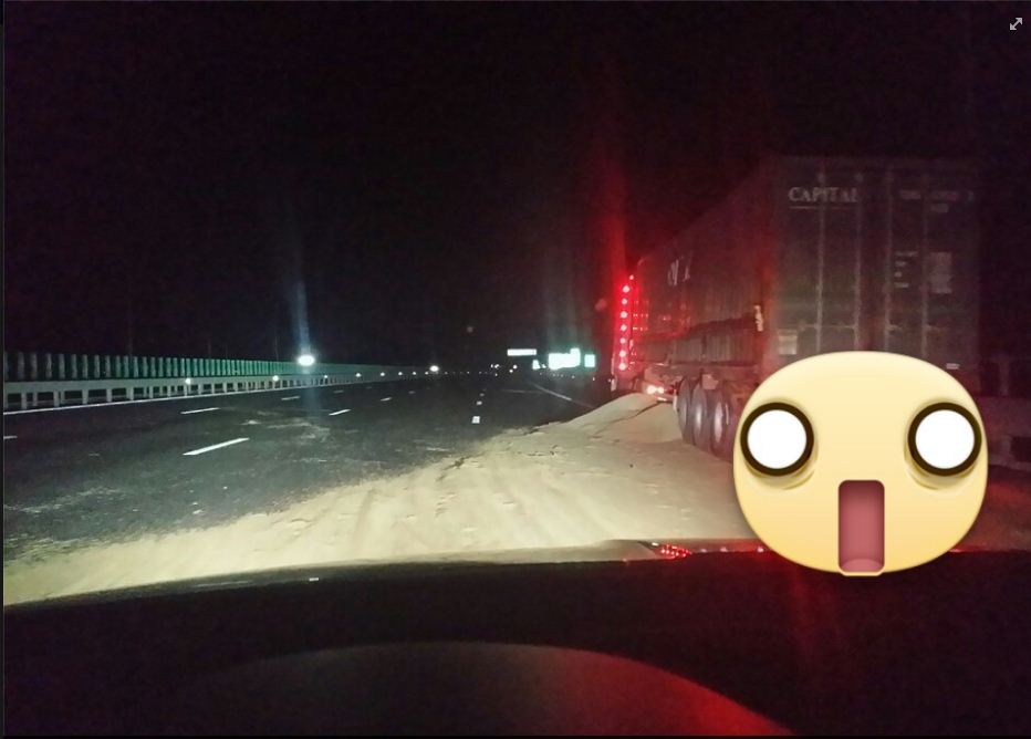 După cum se vede în imaginea nocturnă din autotren s-ar fi împrăștiat pe autostradă o mare cantitate de nisip care acoperă aproape toată partea carosabilă ceea ce ne face să credem că recuperarea mărfii este de lungă durată.
