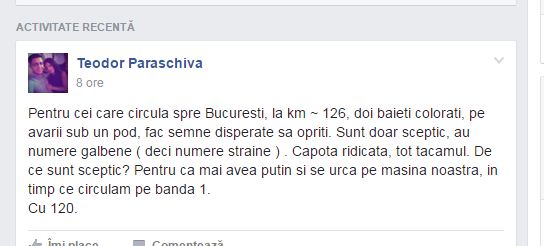 ”Pentru cei care circulă spre București, la km ~ 126, doi băieți colorați, pe avarii, sub un pod, fac semne disperate sa opriți. Sunt doar sceptic, au numere galbene (deci numere străine). Capota ridicată, tot tacâmul. De ce sunt sceptic? Pentru că mai avea puțin și se urca pe mașina noastră, în timp ce circulam pe banda 1.