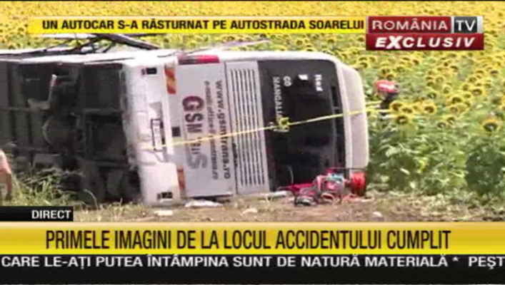 Traficul pe Autostrada Soarelui a fost reluat, după ce, pe sensul spre litoral nu se putea circula deoarece se încerca ridicarea pe roţi a autocarului care s-a răsturnat azi. Amintim că, astăzi, în urma unei coliziuni între un autoturism şi un autocar cu 40 de pasageri, cel din de-al doilea autovehicul a părăsit partea carosabilă şi s-a răsturnat. 36 de persoane au fost rănite, trei dintre ele în stare gravă. La faţa locului s-au deplasat 14 echipaje SMURD şi un elicopter, precum şi mai multe echipaje de poliţie. Pentru a se repune pe roţi autocarul, traficul rutier a fost oprit pentru aproximativ o oră.
