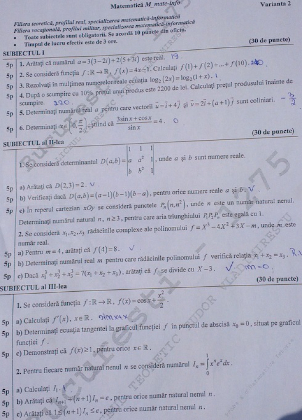 Pentru proba obligatorie a profilului la BACALAUREAT s-au înscris 174.555 de elevi, dintre care cea mai mare parte vor da examenul la MATEMATICĂ - 136.964, iar 37.965 vor susţine proba la ISTORIE. Elevii au la dispoziţie trei ore pentru a rezolva cele trei subiecte. Fiecare subiect este notat cu 30 de puncte.Elevii care dau examen la matematică au de rezolvat până la ora 12.00 VARIANTA 2.
