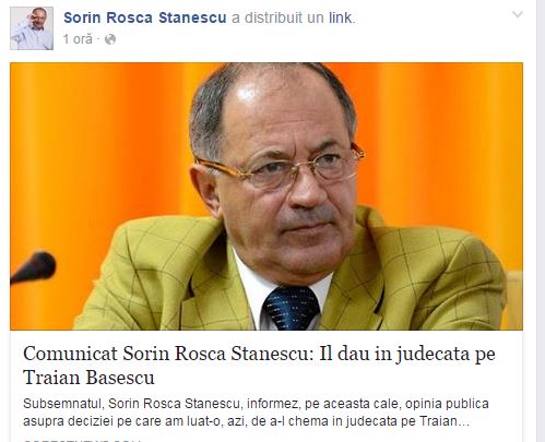 ”Subsemnatul, Sorin Roşca Stănescu, informez, pe această cale, opinia publică asupra deciziei pe care am luat-o, azi, de a-l chema în judecată pe Traian Băsescu, după ce m-am consultat, în prealabil, cu avocatul meu, domnul Dan Chitic.