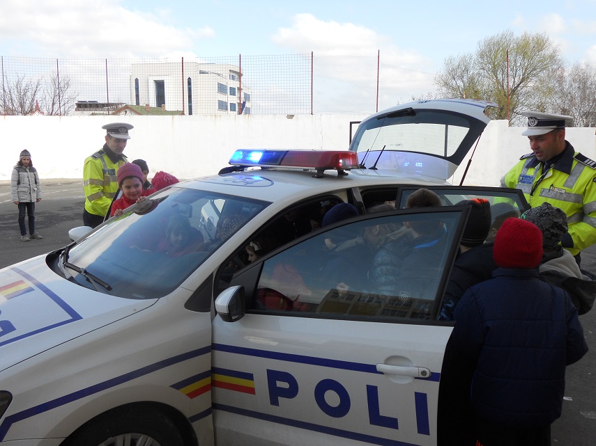 La sfârsitul acestei activități informative, participanții la acțiune au beneficiat de o surpriză din partea polițiștilor, oferindu-li-se posibilitatea de a se familiariza cu modul de utilizare a unei autospeciale din dotarea Poliției Rutiere.