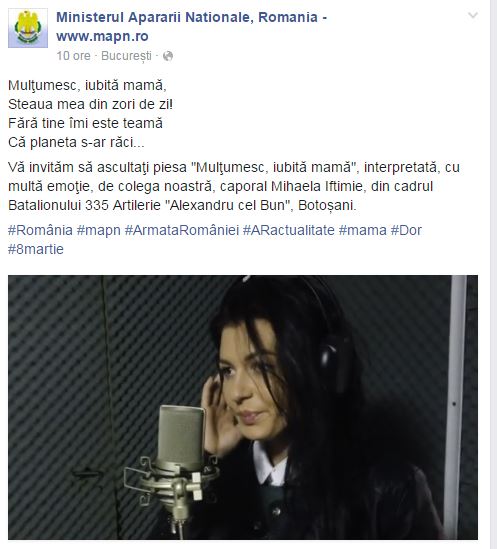 Ministerul Apărării Naționale vă invită să ascultaţi piesa "Mulţumesc, iubită mamă", interpretată, cu multă emoţie, de caporal Mihaela Iftimie, din cadrul Batalionului 335 Artilerie "Alexandru cel Bun", Botoșani.
