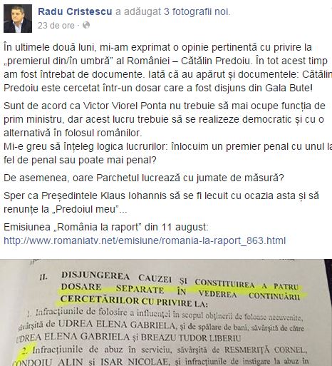 Documentele arată că procurorii au disjuns din dosarul Elenei Udrea o anchetă pe numele lui Predoiu privind avizele pe care acesta le-a semnat, în calitate de ministru al Justiţiei, pentru organizarea Galei Bute. "Disjungerea cauzei şi constituirea a patru dosare separate în vederea continuării cercetărilor cu privire la.... sesizarea corpului de control al primului ministru cu privire la foştii miniştri Ialomiţianu Gheorghe şi Predoiu Cătălin Marian.", se arată în rechizitoriul acestui dosar. Predoiu şi Ialomiţianu ar fi cercetaţi pentru că şi-au îndeplinit defectuos atribuţiile de serviciu semnînd documente care făceau parte din strategia de marketing şi promovare turistică, în care era inclus şi evenimentul Gala Bute.