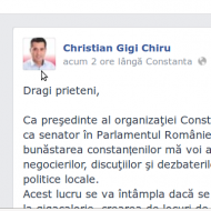 Senatorul şi preşedintele PDL Constanţa, Gigi Chiru, scrie pe pagina sa de Facebook că se va aşeza la masa negocierilor cu partidele politice locale doar atunci când va constata că se urmăreşte bunăstrarea constănţenilor.„Ca preşedinte al organizaţiei Constanţa a Partidului Democrat Liberal şi ca senator în Parlamentul României pot spune că, dacă se urmărește bunăstarea constanțenilor mă voi aşeza, atunci când va fi cazul, la masa negocierilor, discuţiilor şi dezbaterilor cu toți reprezentanții partidelor politice locale.