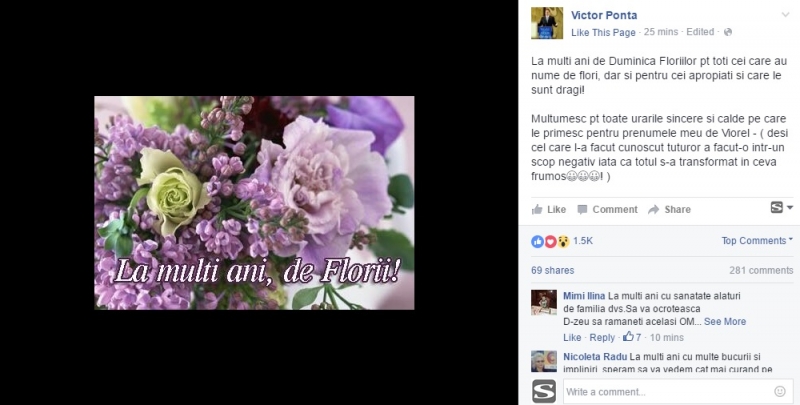 Astăzi, de Florii, aproape 1,4 milioane de români își serbează onomastica. Cu această ocazie, fostul şi actualul premier au transmis mesaje pe paginile lor de Facebook.„La mulţi ani de Duminică Floriilor pentru toţi cei care au nume de flori, dar şi pentru cei apropiaţi şi care le sunt dragi! Mulţumesc pentru toate urările sincere şi calde pe care le primesc pentru prenumele meu de Viorel - (deşi cel care l-a făcut cunoscut tuturor a făcut-o într-un scop negativ iată că totul s-a transformat în ceva frumos :):):)!)", a scris Victor Ponta pe pagina sa de Facebook.